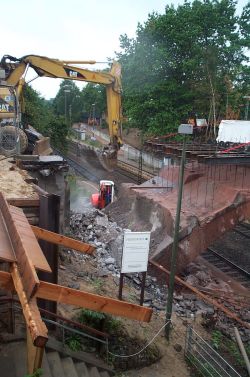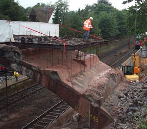 Die Sockel für die neue Brücke sind gegossen. Der Beton muß nun abbinden. Demnächst wird die neue Brücke - oder der erste überspannende Teil davon - aufgelegt, so war der Tagespresse zu entnehmen.