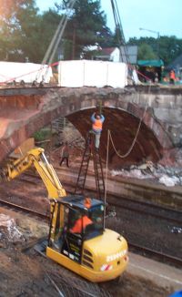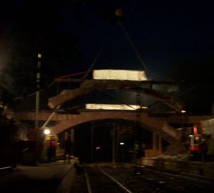 Vor dem Einsatz des Krans müssen natürlich die Oberleitungen demontiert werden. Nach einer Stunde Knabberarbeit der Bagger hebt sich um 21 Uhr das erste Segment (Mitte). Das rechte Bild entstand von provisorischen Holzbrücke, wo sich zeitweise mehr als 50 Personen aufgehalten haben um die Aktion zu beobachten.