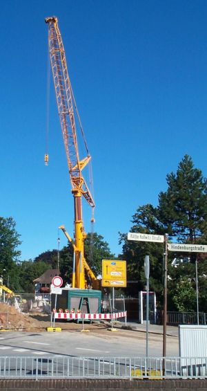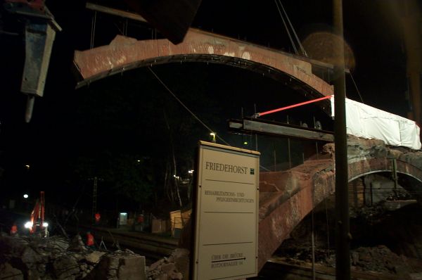 Auf dem Schild steht: zu Friedehorst kommt man "über die Brücke", na das dauert ja noch ein paar Monate. Wer übrigens so lange ausgehalten hatte, und einige machten es sich mit Essen und Trinken gemütlich, der konnte gegen halb zwei Uhr morgens sehen, wie der letzte Teil Brücke in die Luft gehoben wurde. Am Tag danach (Bild unten) bleiben nur noch Aufräumarbeiten.Wir sind gespannt wie's weiter geht.