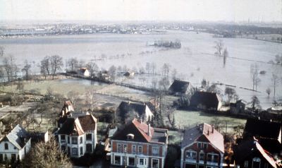 Im Zuge der Jahrhundert-Sturmflut im Februar 1962 wurden auch weite Teile der Lesum-Niederung überflutet. Das vom Lesumer Kirchturm aufgenommene Foto verdeutlicht das Ausmaß der Überschwemmungen. Im Vordergrund die Häuser entlang der Straße „An der Lesumer Kirche“, oben mittig im Hintergrund die Burger Lesumbrücke (Lesum, 1962). (Foto: Archiv HVL)