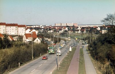 Blick von der Fußgängerbrücke über den noch nicht zur Autobahn ausgebauten Lesumer Schnellweg, der noch Raum für separate Fuß- und Radwege bot, zu den Wohnanlagen „Auf dem Halm“ (links) und „Marßeler Feld“ (Mitte, am Horizont). Die Halmsiedlung wurde im Jahr 1959 fertiggestellt; etwa zwei Jahre später wurde mit der Bebauung des Marßeler Felds begonnen (Lesum, 1970). (Foto: Archiv HVL)