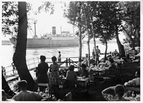 Das Foto von Imhoffs Gaststätte“ mit Sommergarten vor dem Deich entstand ca. 1956. Der Blick auf die Weser mit ihrem damals noch lebhaften Schiffsverkehr war eine Attraktion. Die Wirtschaft