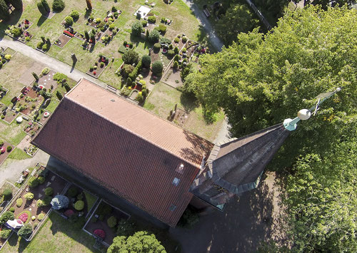 Die evangelische Pfarrkirche ist 1722 errichtet worden, es wird also in Kürze das 300-jährige Bestehen der Grambker Kirche begangen! Der Kirchturm mit quadratischem Grundriss und einer Höhe von 27,2m stammt allerdings von 1864, denn die Kirche besaß anstelle eines Turms zunächst lediglich einen kleinen Dachreiter. Dieses Foto wurde im September 2018 von einer Drohne aus aufgenommen. Wir bedanken uns bei der Evangelischen Kirchengemeinde Grambke herzlich für die Bereitstellung der Aufnahme für diesen Kalender (Bearbeitung R. Dohr). Denkmalschutz seit 1973