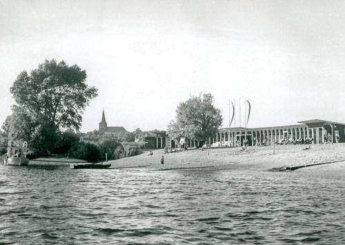 Das Strandbad an der Lesum wurde am 21.06.1936 eröffnet. Der Architekt Dipl. Ing. Eberhard Gildemeister entwarf und baute diese für damalige Verhältnisse großzügige Anlage. Die Außenwand des Gebäudes bestand aus einem Staket in einer Höhe von circa drei Metern. Die Zwischenflächen des Holzgebäudes waren dunkelrot gestrichen. Am Eingang wehten vier Flaggen. Im Gebäude befanden sich 32 Einzelzellen zum Umkleiden und Toiletten. Es gab eine Duschanlage für Männer und Frauen. Auch ein Springturm wurde auf einem im Wasser liegenden Boot installiert. Leider brannte das aus Holz errichtete Gebäude zehn Jahre später (1946) aus unbekannten Gründen ab und wurde nicht wieder aufgebaut.