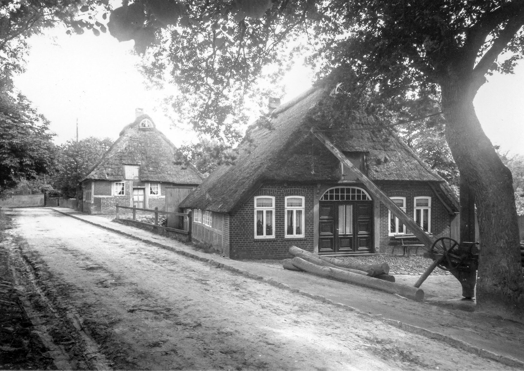 Das Foto zeigt zwei Strohdachhäuser in der Straße „Marßel“. Das vordere Haus – es stand gegenüber dem heutigen Grundstück des Hauses Marßel 8 – gehörte Nicolaus Wessel. Von 1908 bis 1951 betrieb er hier eine Stellmacherei. Nicolaus Wessel war der Stiefsohn vom Stellmacher August Heckert, dem dieses Haus vermutlich vorher gehörte. Am Baum rechts steht ein manuell zu bedienender Kran, um Baumstämme anzuheben. Diese einst bäuerlich geprägte Straße gab dem nahe gelegenen Neubaugebiet später seinen Namen.