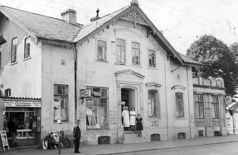 Mai 2024: Gärdes Hotel / Friseursalon Schlüter; Burger Heerstr. 38 (Burg); Foto: 1950er Jahre „Gärdes Hotel“ war seit 1865 in der Burger Heerstraße ansässig, mit dem Ausflugslokal „Gärdes Garten“ hinter dem Hotel. In den 1920er Jahren befand sich im rechten Anbau der Papier- und Zigarrenladen Behnsen. Links im Anbau betrieb eine Familie Gräper einen Kiosk. Im Eingang des Hauses stehen die Eheleute Schlüter mit Tochter Karin, die dort einen Friseursalon betrieben. Durch Aufstockung erhielt das Haus in den 1950er Jahren sein heutiges Aussehen. (Archiv HVL F02616)