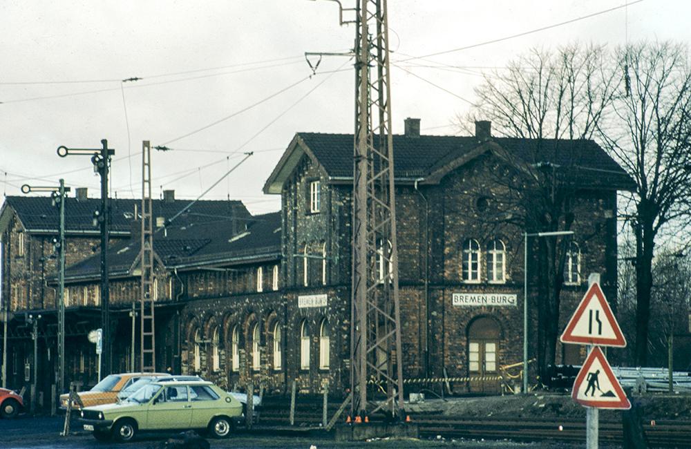 Juni 2024: Burger Bahnhof; Bremer Heerstraße (Burg); Foto: 1950er Jahre Der Burger Bahnhof wurde während des Ausbaus der sogenannten „Geestbahn“ nach Bremerhaven 1861/62 errichtet. Eine Fahrt von Bremen nach Bremerhaven dauerte 2 Stunden und 45 Minuten. Ende 1862 wurde die Bahnverbindung von Burg nach Vegesack eröffnet. Aufgrund der Intensivierung des Verkehrs – insbesondere des Güterverkehrs – wurde der Bahnhof in den 1970er Jahren erneuert und erweitert. Ein Teilabriss und der Umbau fanden ab 1980 statt. Ende der 1990er Jahre erhielt das Gebäude einschließlich Parkhaus seine heutige Gestalt. (Archiv HVL F04115)