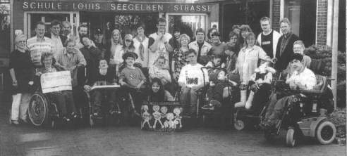 L E S U M (th). Schüler der Schule an der Louis-Seegelken-Straße erhielten die gute Nachricht "aus erster Hand": Die geplante therapeutische Spiel- und Bewegungslandschaft muß keine Utopie mehr bleiben. Die "Mulligan Music Makers", eine beliebte Skiffle, Oldie und Folk Formation aus dem Kreis Osterholz, kamen mit einem Scheck in Höhe von 4120,44 Mark in die Lesumer Schule, um mit Hilfe des großen Geldbetrages die gute Idee aktiv zu unterstützten. Elternvertreter und Schulleitung zeigten sich sehr erfreut über die noble Geste, die den körperbehinderten Kindern unmittelbar zugute kommen wird. Foto: th