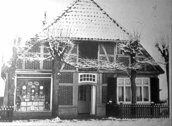 Nach seinem Tod 1871 übernahm der zweite Sohn Fritz das Geschäft. Unverheiratet starb er 1878 und so fiel Haus und Geschäft als Erbe an die Schwester Beta. Sie hatte sich mit dem Steuermann Hermann BEHRMANN aus Grohn verheiratet, aber sein Schiff verscholl. Da freite 1880 der Nachbarsohn Hinrich SCHMIDT die damals 37 jährige Witwe. Beta (Beetjen genannt) und Hinnerk führten in diesem Haus eine gemütliche Gaststube mit dem Namen „Börse“ und einen kleinen Kramerladen mit den gängigen Kolonialwaren. Nur das Schaufenster links (siehe Bild) verriet mit seinen Auslagen die Krämerei. Beim Eintritt durch die Haustür mit dem Oberlichtfenster auf die große Diele schaute man gleich auf dem Tresen. Davor standen dicke Fässer mit Sauerkraut und Heringen, dort gab es Säcke mit Reis, Rohkaffee, Mehl und Linsen. Auf dem Tresen stand die große Balkenwaage, Gläser mit Bonbons, Lakritzen und Vanille. Unter der Decke baumelten Holzschuhe und Pantinen. Dahinter in den Fächern der Regale die Krüge mit Öl, Essig und Senf, darüber Zucker, Salz und Gerste. Auf den Borten Seifenpulver, Kernseife und sonstige Putzmittel, alles im allem eine Krämerei ländlicher Prägung um die Jahrhundertwende.